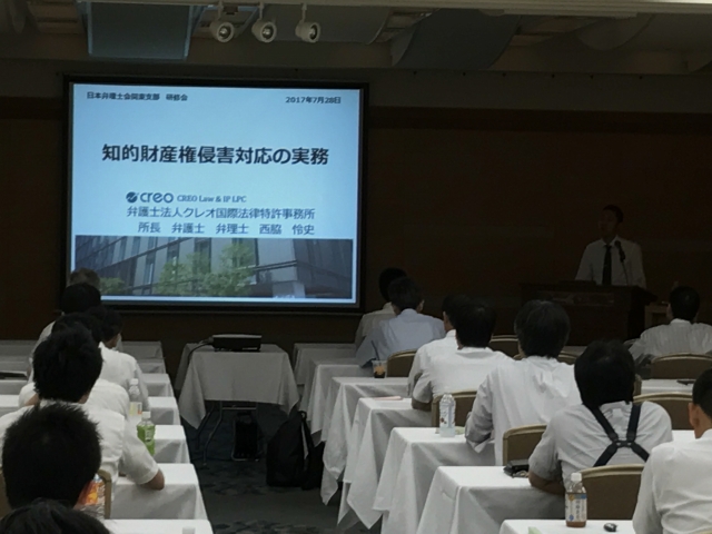 Home › トピックス › 弊所所長西脇怜史が、日本弁理士会主催の研修会講師を務めました。 2017-08-01 弊所所長西脇怜史が、日本弁理士会主催の研修会講師を務めました。 日時:2017年7月28日研修内容:【知的財産権侵害対応の実務】 主催:日本弁理士会関東支部場所:ホテルラフレさいたま 『知的かけはし』2017年7月号 『知的かけはし』2017年8月号