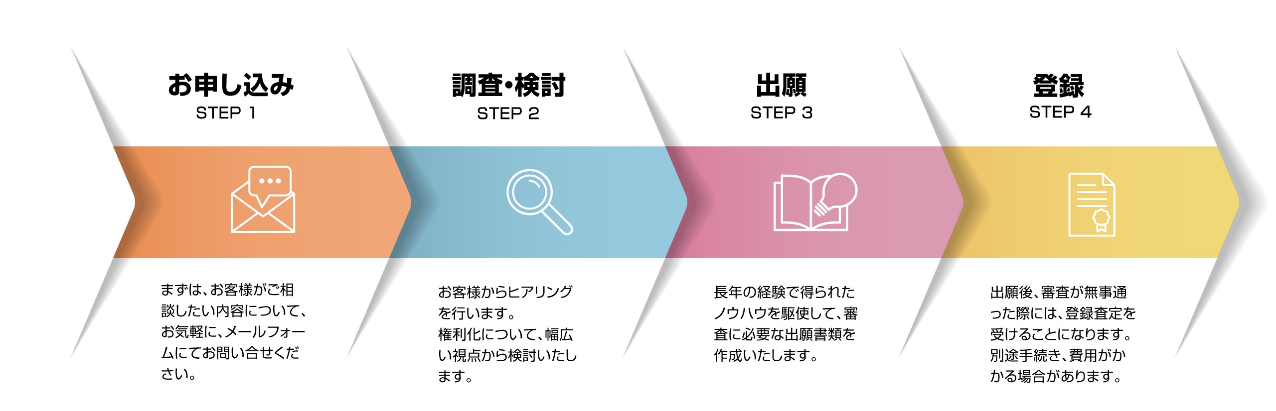 特許については、特許庁に審査をしてもらう手続が別途必要となりますが、そのタイミングは、お客様とご相談の上、適切なタイミングで行います。